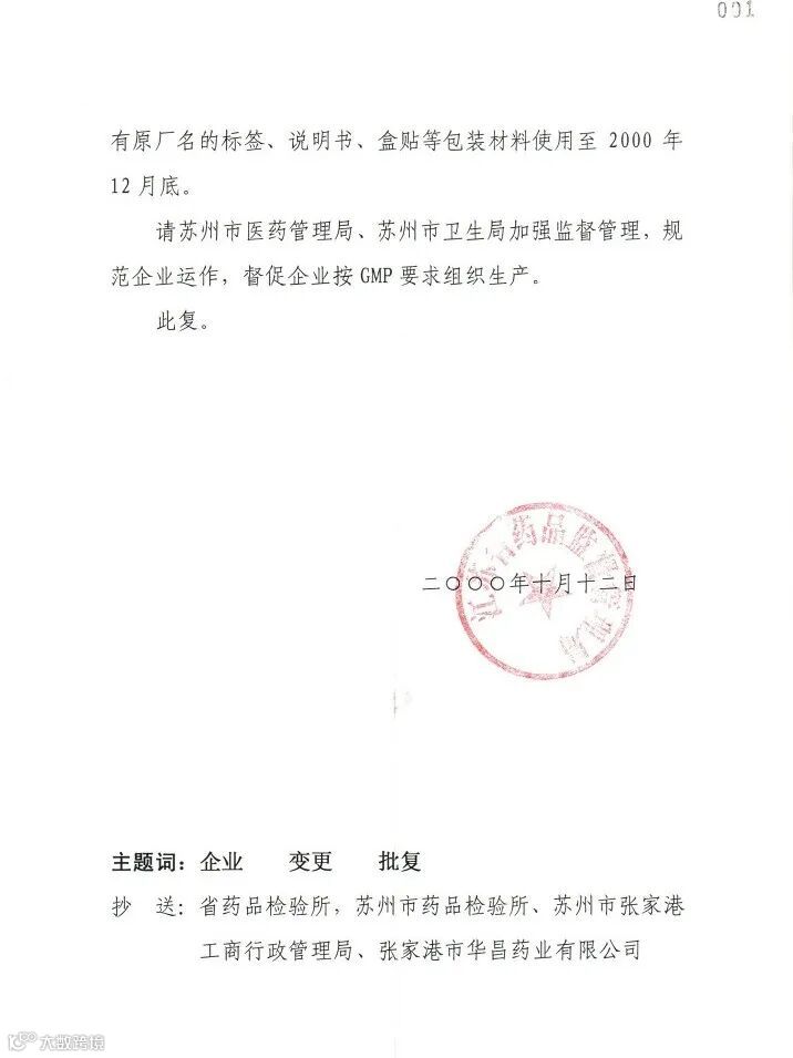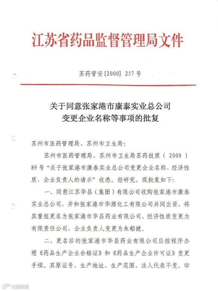 2000年10月12日,经江苏省药品监督管理局苏药管安[2000]257号文批准,“张家港市康泰实业总公司”正式更名为“张家港市华昌药业有限公司”。标志着该业务板块在集团化发展中被赋予了更专业的市场定位,为其在日益规范的医药市场中合规经营与品牌塑造铺平了道路。