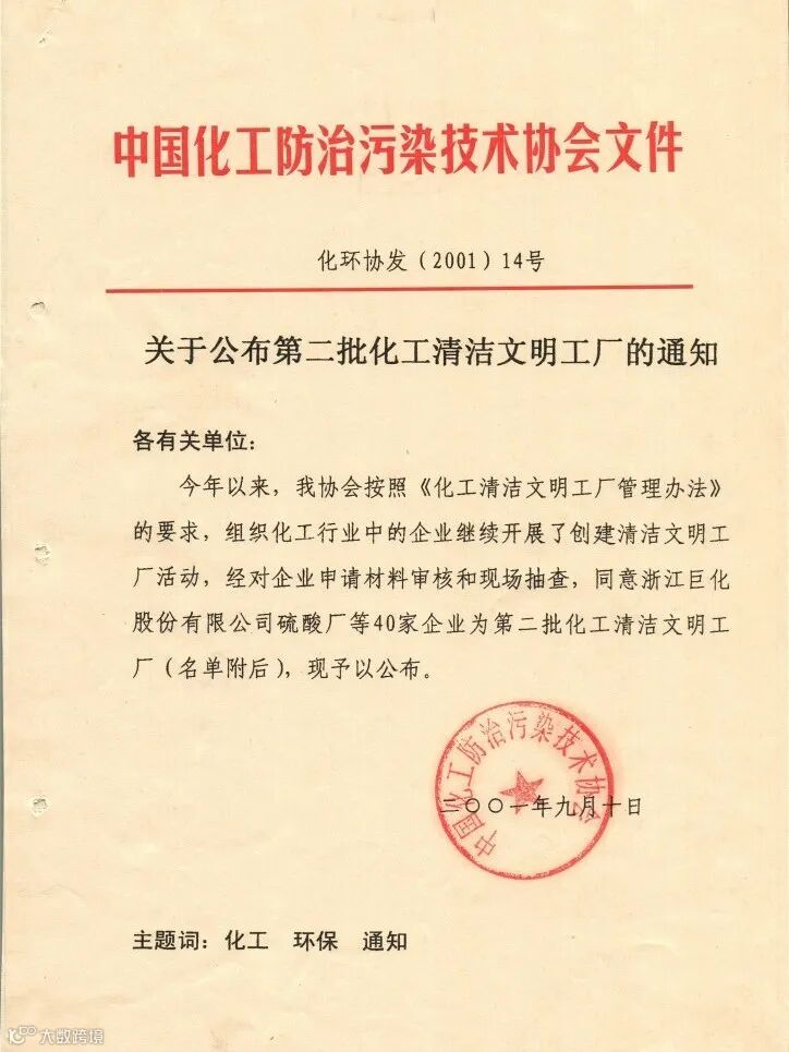 2001年10月18日,公司获中国防治污染技术协会授予“化工清洁文明工厂”荣誉称号。这一荣誉不仅是对公司长期致力于环境保护、推行清洁生产和末端治理成果的高度认可,更标志着公司在实现经济效益与环境效益协同发展上走在了行业前列。