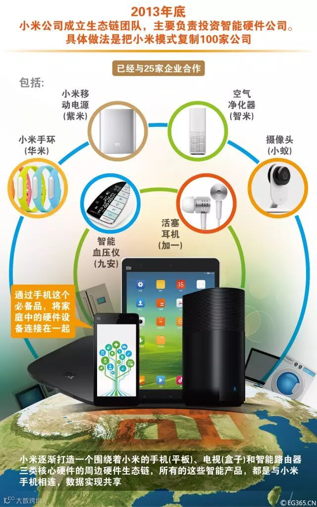 根据雷军的计划,5年内,小米会投资100家生态链企业,复制小米模式。他还有另一层考虑:通过复制小米模式,让专业的团队更高效、专注的做出更多高品质的硬件产品,跟智能手机紧密有效的整合在一起,进而增加小米的安全感。