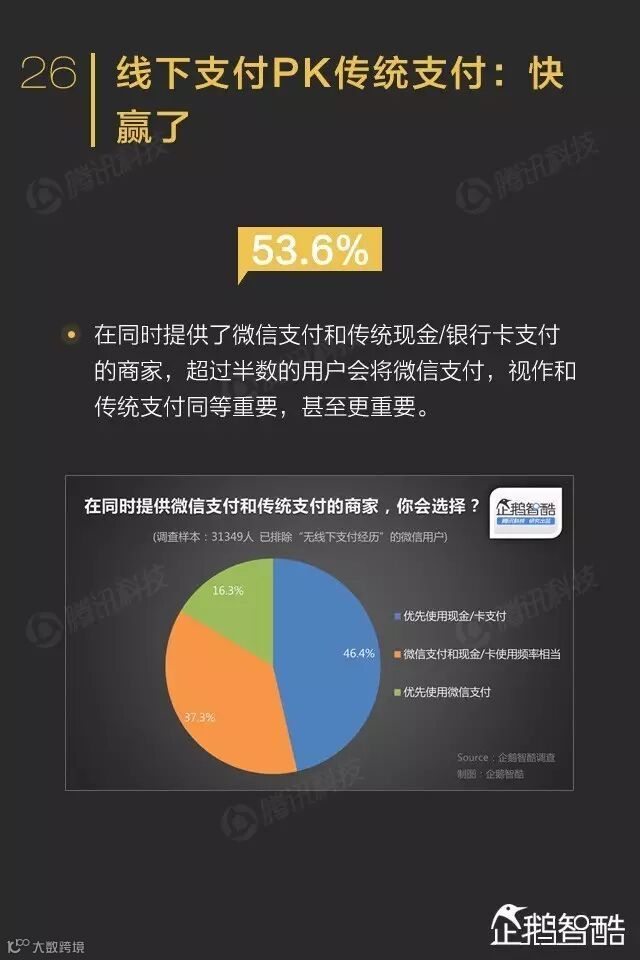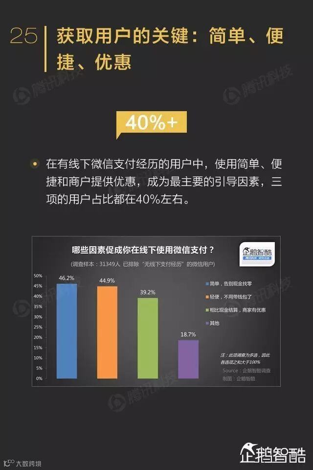 微信支付走向线下的优势是简便和优惠,超过半数用户将微信支付视作线下付款的重要工具