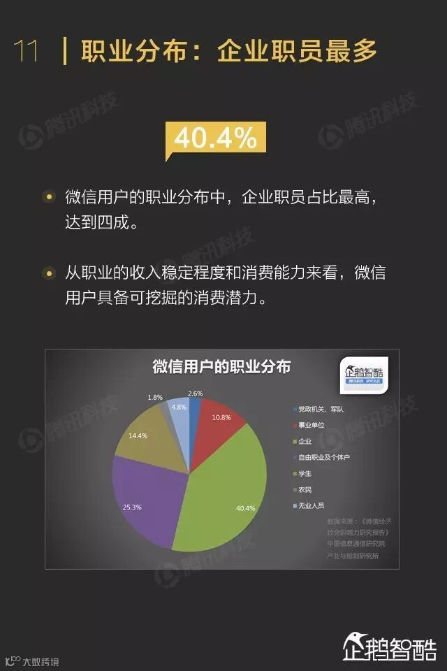 微信用户中男性用户居多,企业职员占比超过四成
