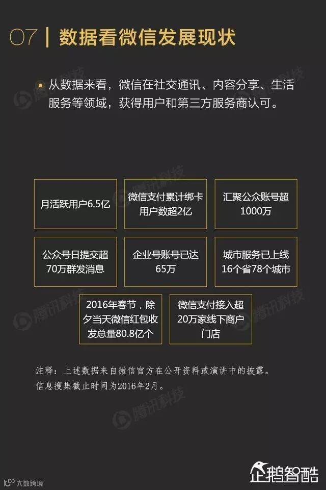 这次我们带来最新的2016版《微信数据化报告》,涵盖 社交、支付、媒体、生活服务、企业服务 五项微信业务的数据和趋势解读。