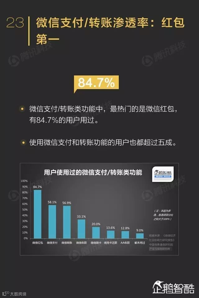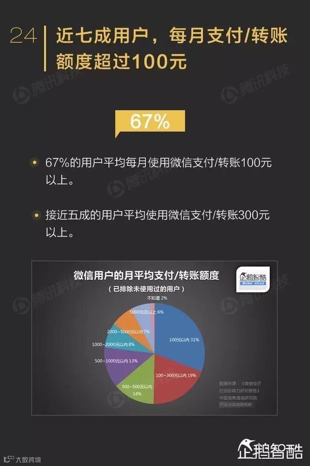 微信红包是微信支付中渗透率最高的功能,近七成用户每月支付/转账额度超过100元