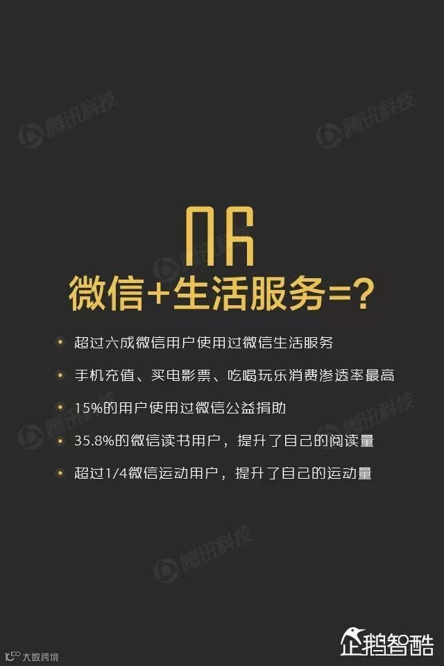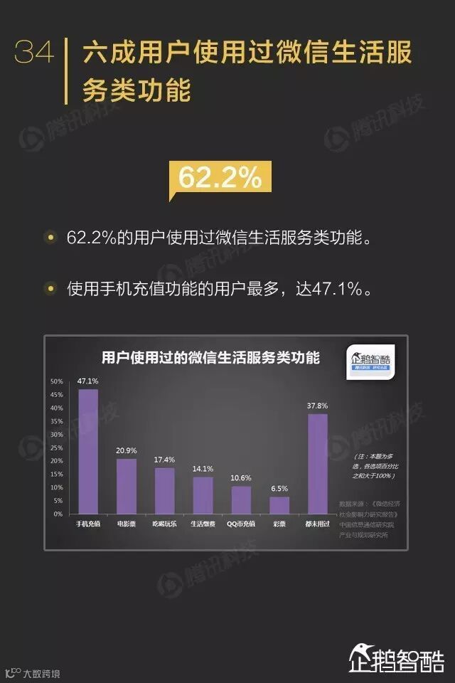 超过六成微信用户使用过微信生活服务,手机充值、买电影票、吃喝玩乐消费渗透率最高