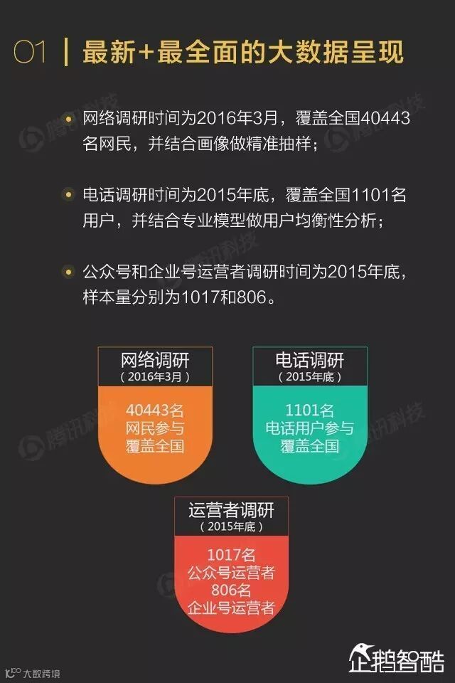 样本分别覆盖全国40443名网民和全国1101名电话用户。以及1017位微信公众号运营者和806位微信企业号运营者。