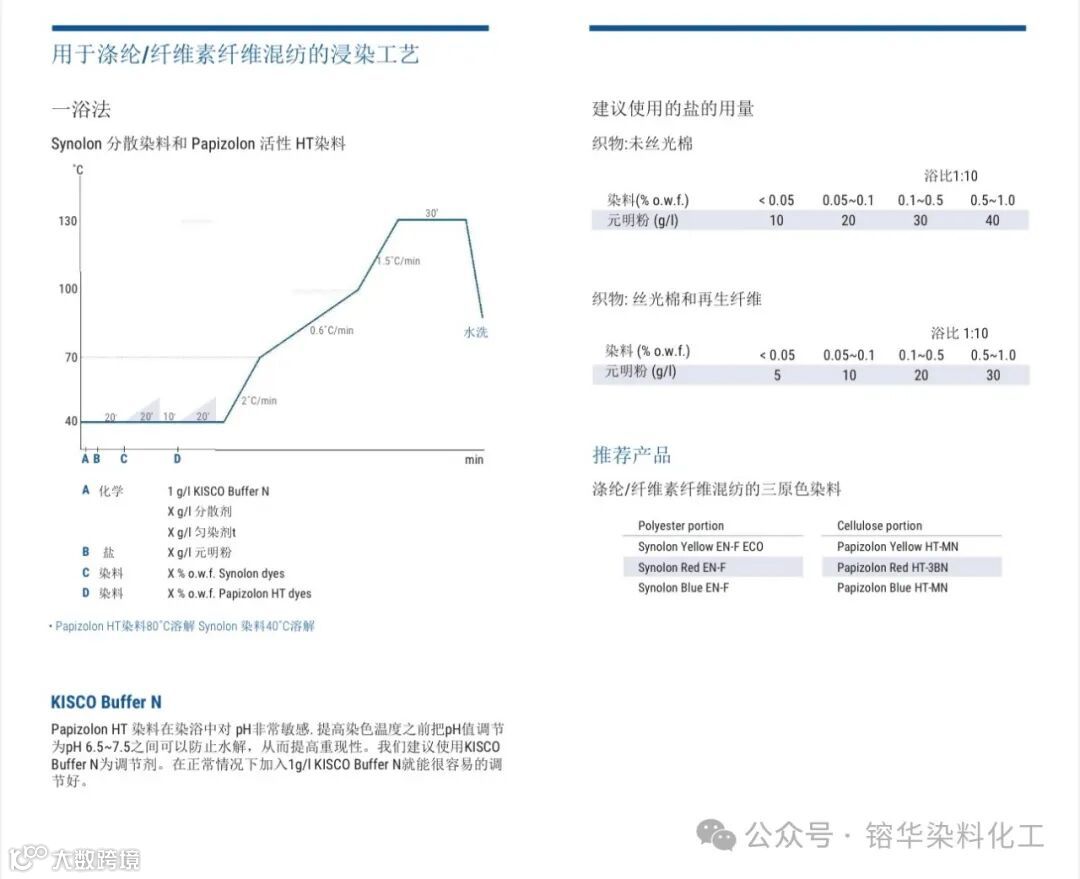 Synolon EN-F染料可以同Papizolon HT染料混使用于涤棉/纤维素纤维混纺的一浴法染色。