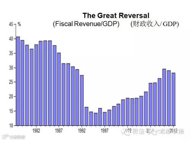 这张图告诉我们,前20年,政府财政收入占国家GDP比重不断下降,市场调节发挥决定性作用,经济的增长动力来自于市场效率的提高,后20年,政府介入宏观调控,民间角色不断减弱,经济虽然保持比较高的增长速度,但并不具备可持续性。