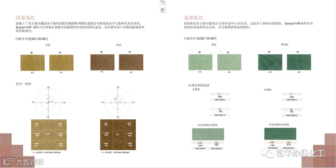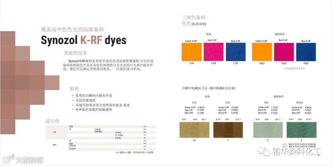 导读:synozol K-RF染料是具有中浅色色光的高性能染料,它们在浸染和连续染色中具有良好的再现性以及杰出的汗光和汗耐光牢度。他们可以满足零售商的需求,一次染色成功率高。