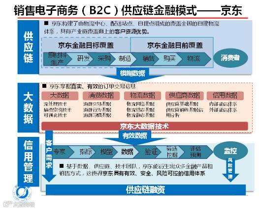 京东基于它的采购数据、物流数据、消费数据,构建自己的授信模型,以这些模型为基础对供应商授信。基于信息的整合,数据的模型,可以正确甄别应收应付,三分钟即可放账。由于京东金融有物流、有自营采购做支持,所以不太会作假,这个很关键。