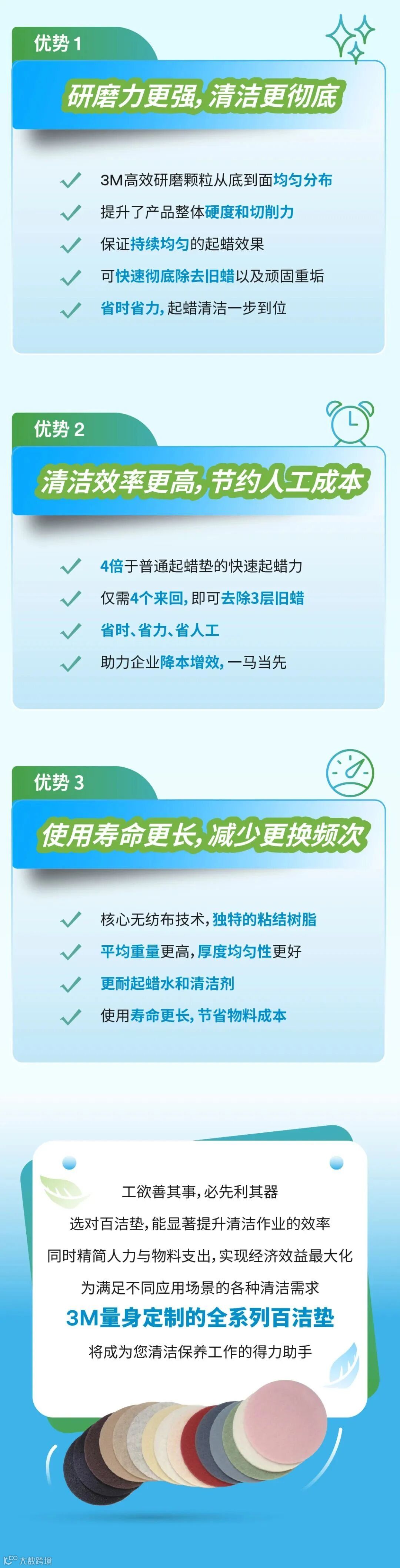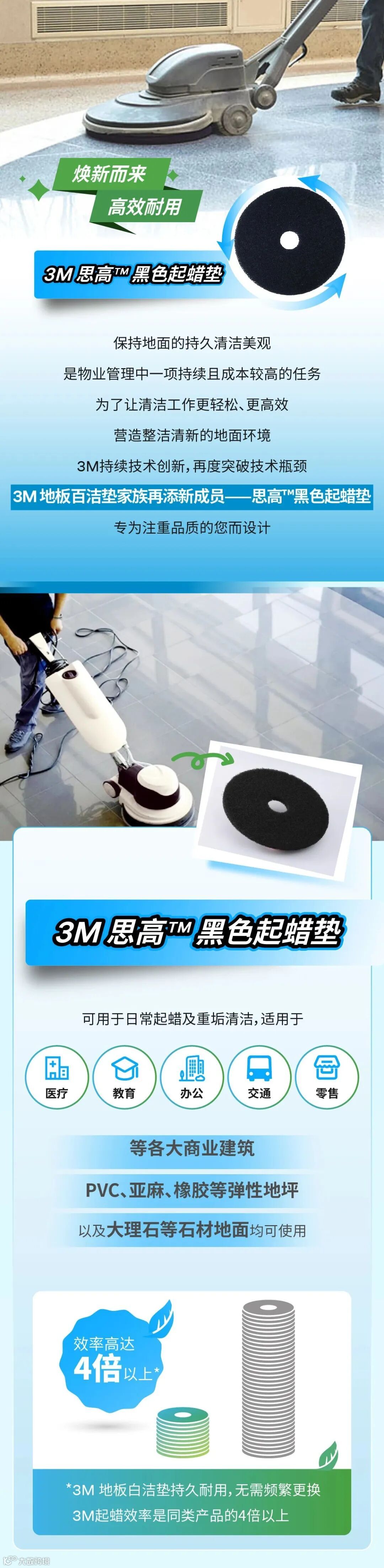 地坪养护中顽固蜡层难以彻底清除?3M黑色起蜡垫以“强力磨削+省时省力”双重优势,成为行业破解起蜡难题的标杆方案!其独家设计的粗粒度金刚砂复合结构,可快速剥离陈旧蜡层、封地剂及污渍,单机作业效率提升50%以上,且不伤石材基底。某大型商场物业反馈:“原需2天完成的起蜡工程,使用3M黑色起蜡垫后缩短至6小时,地面平整度完全达标!”