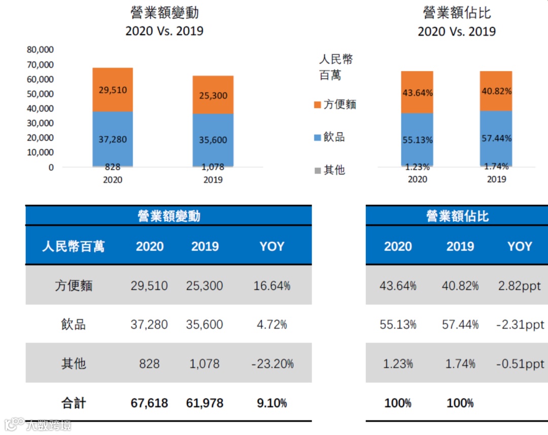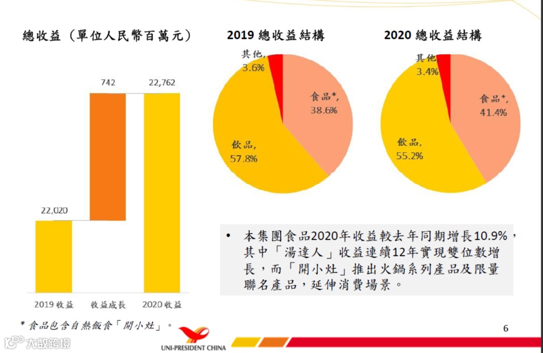 统一企业年报显示,2020年度集团录得收益人民币227.62亿元,较2019年220.20亿元的收益上升3.4%,食品业务收益上升10.9%至94.25亿元,饮料业务收益下降1.3%至125.60亿元,占集团总收益的比重分别为41.4%及55.2%。