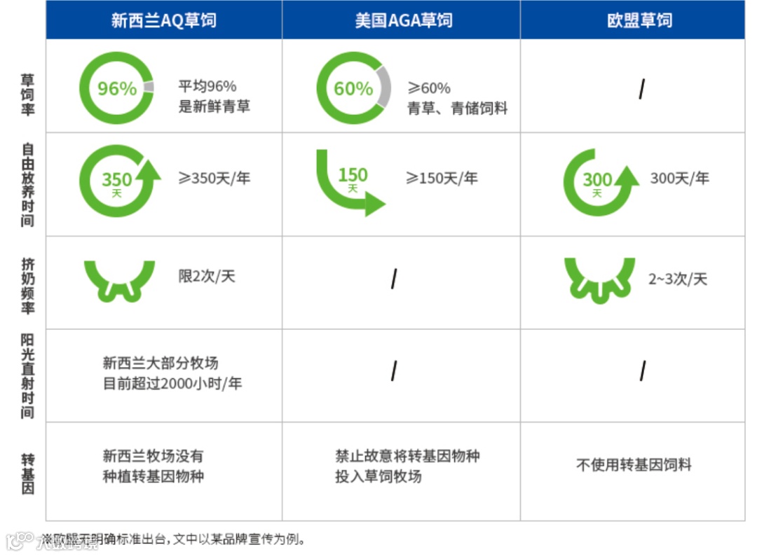 目前,全球仅10%的牛奶属于“草饲牛奶”,集中在美国、欧盟和新西兰。各国的草饲认证标准不尽相同,其中草饲率、自由放养时间是关键指标。以相对较为宽松的美国草饲标准为例,必须使用超过60%的牧草喂养,每年自由放牧超过150天才能通过认证。作为对比,有机畜牧认证仅需要超过30%的牧草喂养,以及120天的自由放牧要求。因此,将草饲牛奶视为高端奶源的顶峰也毫不为过。