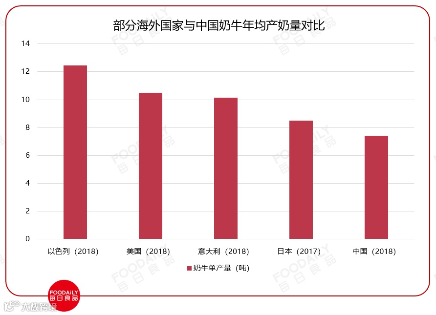 自2014年以来,中国奶牛单产量基本保持7%的增长率。预计2020年将达8.2吨的水平。在全球居于中等偏上,高于欧盟6.8吨的平均值(2018年),但与海外高产国家相比仍有较大差距。