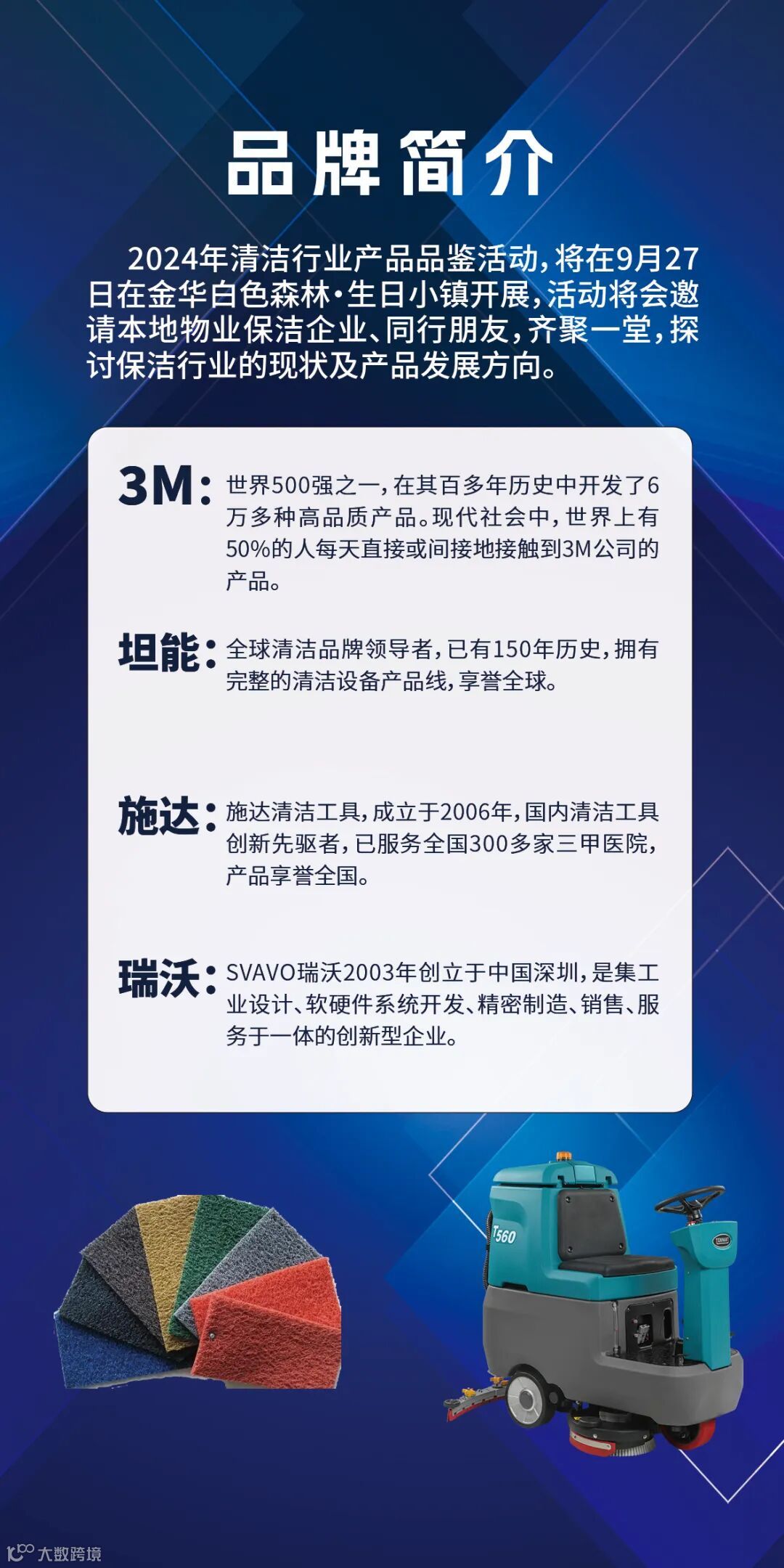 2024年9月27日,我司将举办2024年清洁产品展示、推荐、交流活动,诚邀广大好友齐聚一堂,探讨保洁行业的现状及产品发展方向。