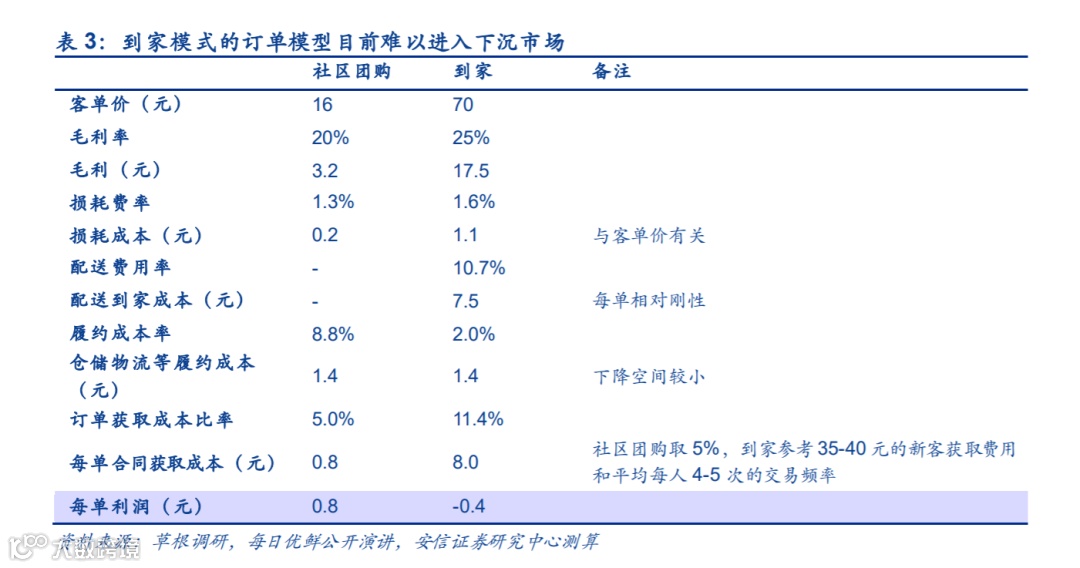 在高毛利的特点外,社区团购目前呈现出良好的可复制性。美团、橙心优选等社区团购业务在成都、济南等地区,单位人口能产生的订单量相当接近。这意味着,除去拥有相对完善的生鲜零售渠道,以及人口密度低的中西部地区,社区团购的模式可能适用于大部分下沉市场。