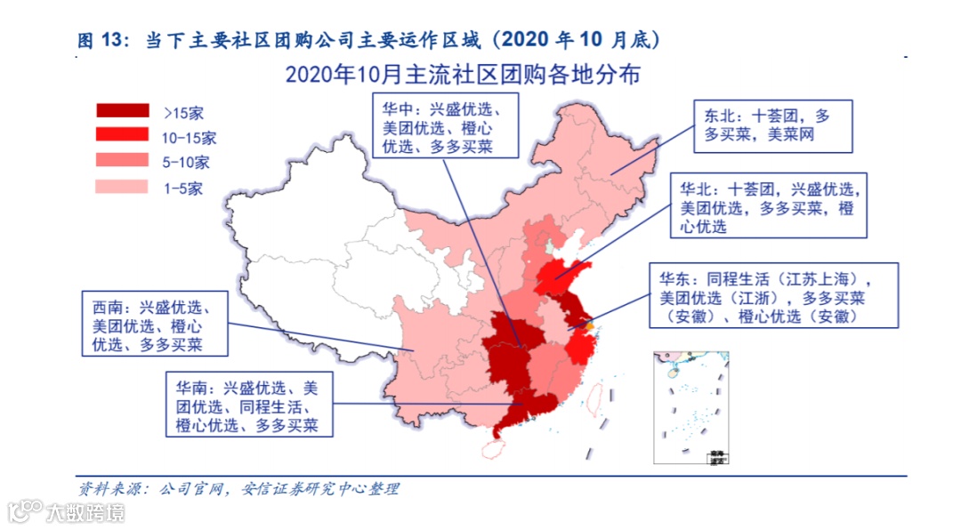 如果根据市场调研和证券机构的测算,社区团购的市场规模可能是2019年生鲜电商的1.6-5.3倍。按照安信证券的测算,按照现有的用户数x购买频次x客单价模型进行计算,社区团购市场空间在4608亿-14965 亿之间。这是个可观的数字。作为比较,目前整个生鲜零售规模稳定在5万亿的体量上,起步于2005年、发展了15年的生鲜电商至今规模也只有2796亿元。