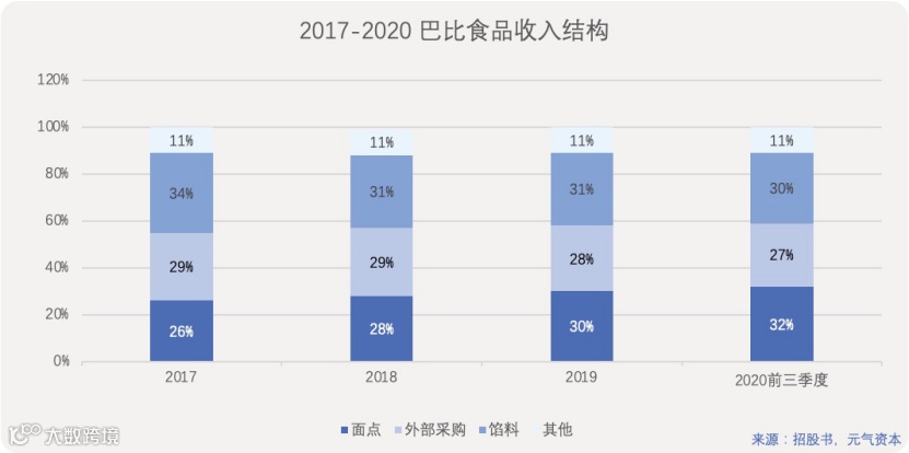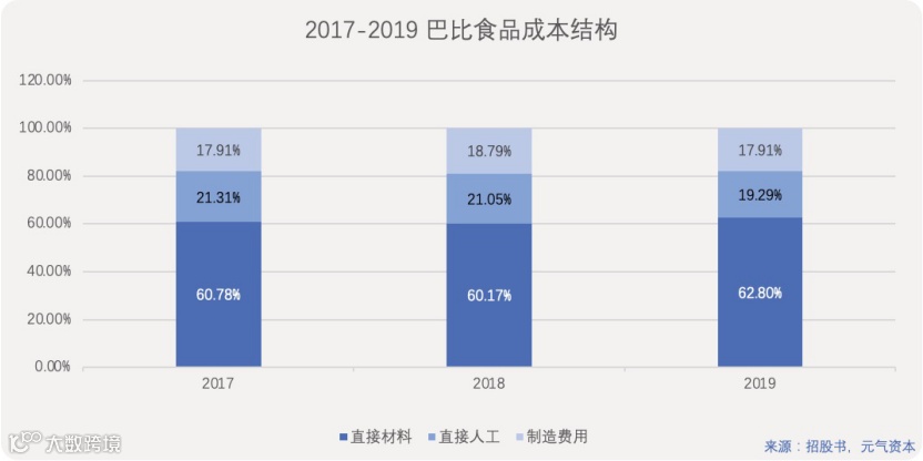 从成本结构拆分来看,巴比符合食品公司特征,直接材料的占比最大。
