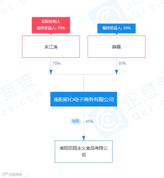 从目前的信息虽然并不能判断这家新公司的业务模式是什么,与轻食有什么关系,但值得注意的是,这家公司的法人代表朱江涛,应该是轻食届的老手了。据悉,朱江涛同时也是南阳初心电子商务有限公司法定代表人,这家公司曾于2019年8月投资450万元人民币于田园主义食品有限公司,持股45%,因此才诞生了现在的网红轻食品牌田园主义。