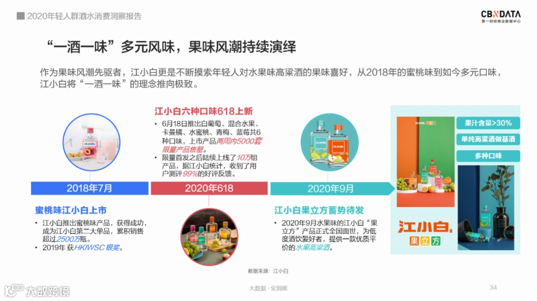 据悉,水果味的江小白系列上市两周内5000套产品快速售罄。经过用户反馈、优化升级,水果味江小白系列