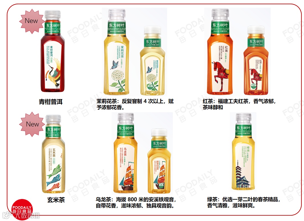 于2011年成立的东方树叶,目前包含乌龙茶、茉莉花茶、红茶、绿茶4款系列产品。而近日,东方树叶上新的新品分别为青柑普洱、玄米茶。