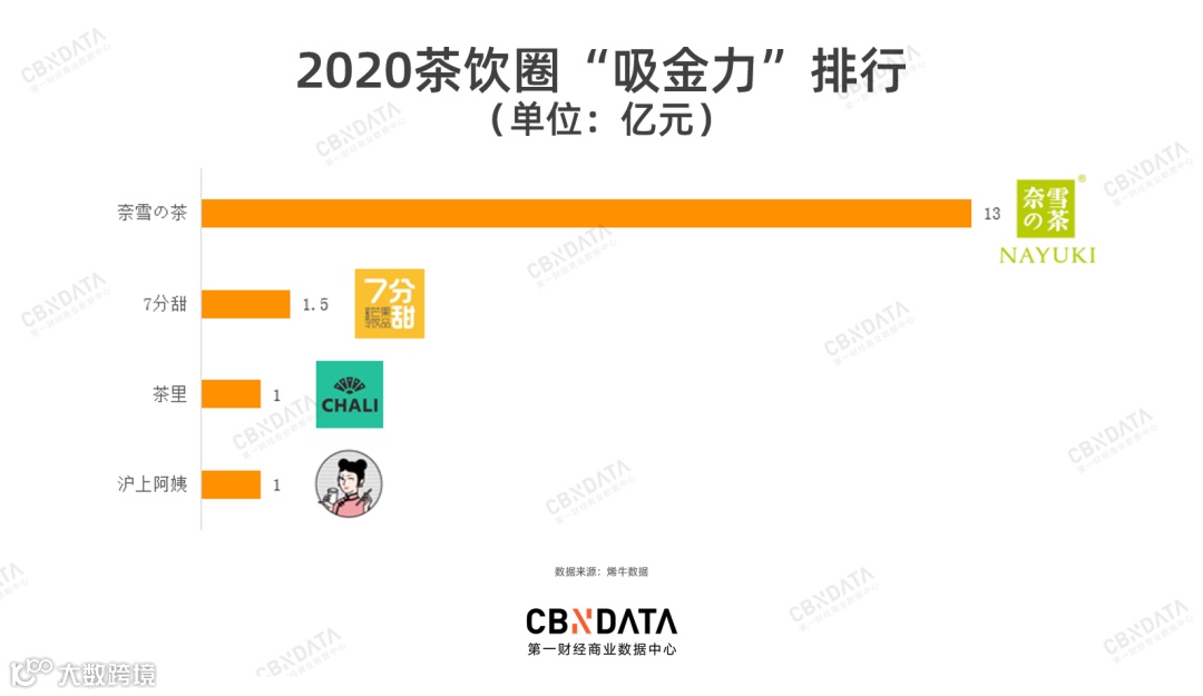 但是,消费者在花钱买快乐的同时,不想再给身体增添额外负担。这带动了低糖低卡的低度酒,以及注重原叶茶、鲜奶和鲜果原料的新式茶饮,在这一年备受资本关注。2020年,茶饮市场融资事件同比增44%,并吸引顺为资本、碧桂园创投等资本“新面孔”聚首该赛道。奈雪的茶分别在2020年6月、12月完成B、C两轮融资,总金额高达13亿元,是茶饮赛道“吸金力”冠军选手。