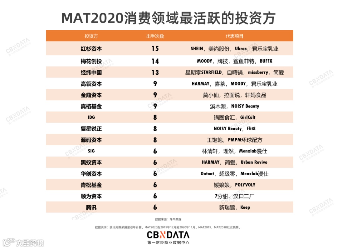 梅花创投是2020消费领域除红杉资本外最活跃的投资机构。该机构此前更多关注互联网领域。梅花创投合伙人张筱燕在2020年初的公开演讲中表示,“互联网的流量红利在消失,增长见顶。”梅花创投2020年的投资计划第一条就是“新的消费品,包括新的消费品类和新的消费品牌。每一个品类和品牌都有重新被做一次的机会,而中国巨大的市场和成熟的供应链为这些提供了很好的基础。”