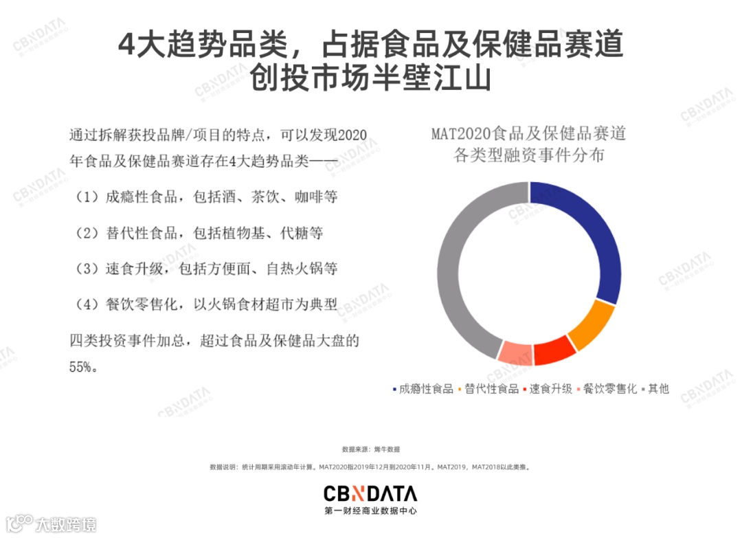食品及保健品赛道的融资事件,在整个消费领域的占比高达41%。CBNData消费站通过对投融资事件的分析,找到了占领该赛道半壁江山的4大趋势品类。概括来讲,健康、便捷是这4大趋势品类的共同特点。