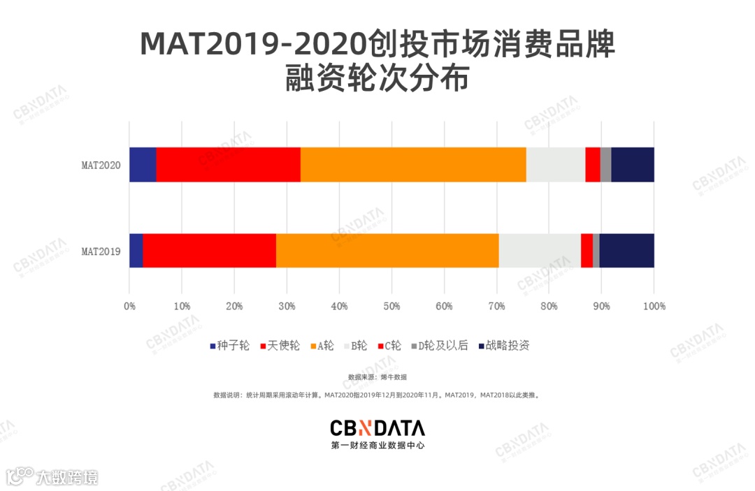 2020年,投资机构对潜力消费品牌的争夺更激烈了。从融资轮次来看, 2020年A轮及以前投资事件占比明显增大。其中种子轮的占比,较2019年翻番。资本对消费领域普遍看好,并加速进行提早布局。