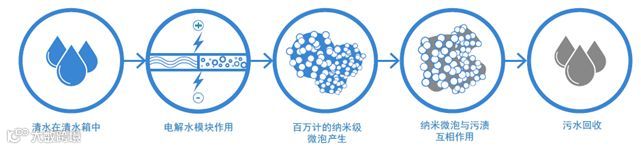自来水到电解水纳米微泡的转变来自坦能设备机载的ec-H2O™或ec-H2O™NanoClean™模块,它可以生成数以百万计的纳米级微型气泡,这些纳米气泡可以有效提高清洗效率。