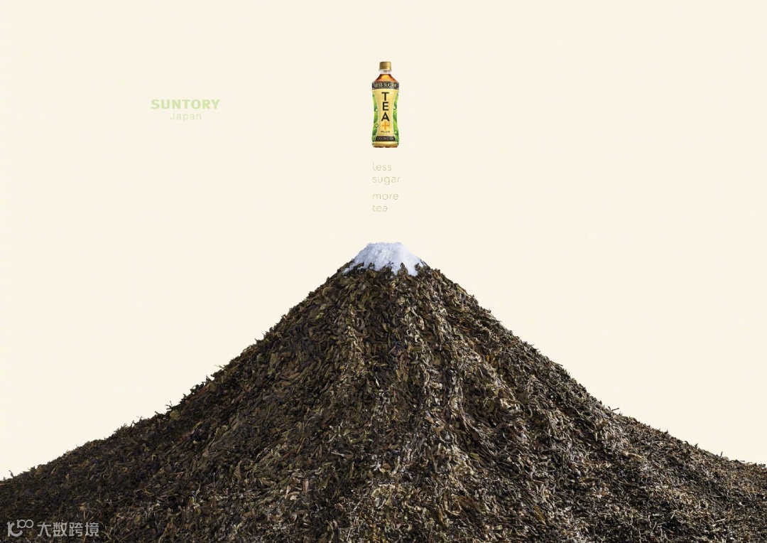 乍一瞅是富士山,但仔细辨认就会发现,整个山体其实是茶叶堆起来的,而山顶的“雪”其实是一小撮糖,“少糖”的主要信息就这么被表达出来了!