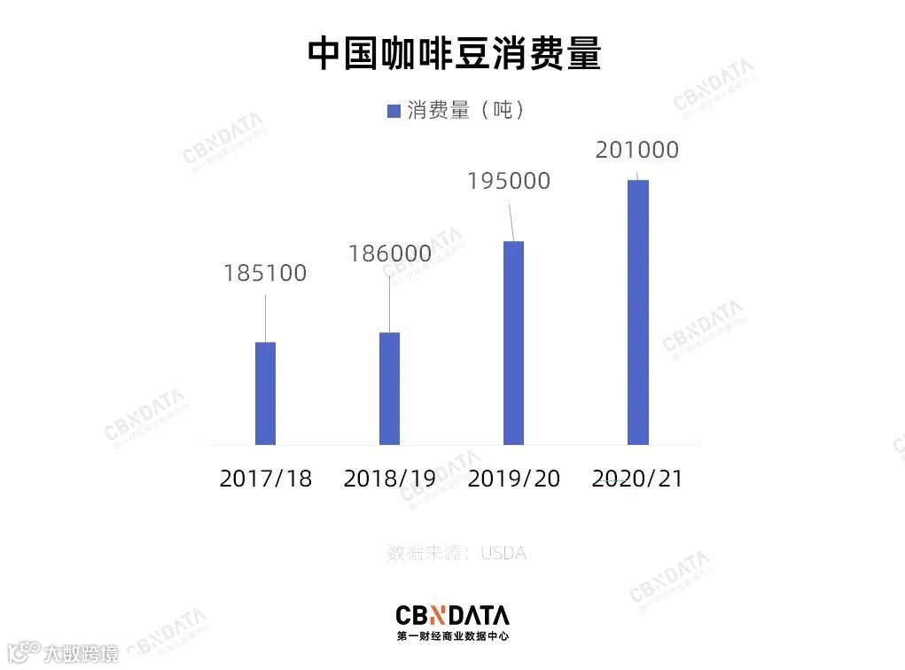 根据USDA(美国农业部)的数据,中国2019年(2019年7月-2020年6月)消耗了19.5万吨的咖啡豆。从该数值能得到较悲观的静态市场规模。
