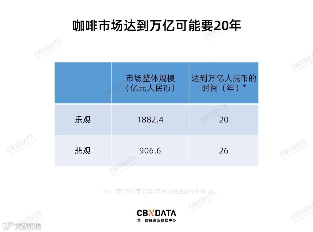 根据星巴克的业绩能推算出一组较乐观的数据。据其财报,星巴克在中国市场2019年收入为29.51亿美元(约合203.3亿元人民币)。而这家公司占中国现磨咖啡市场的60%左右。由此可以推算出整个现磨咖啡市场在338.8亿元左右。根据现磨在整体咖啡市场18%的市占率,可以推算中国咖啡市场的总规模为1882.4亿元人民币。在这个前提下以乐观的增速计算(9.3%),达到万亿人民币规模也需要20年。