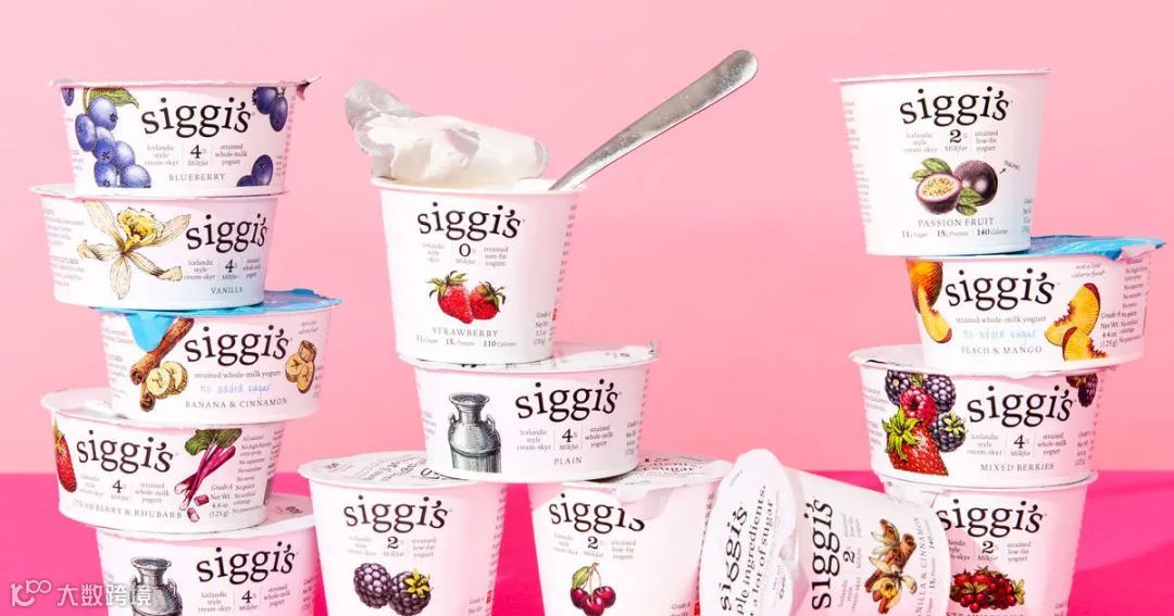 作为冰岛酸奶的另一位代表品牌,Siggi’s则有意避开情感套路,更多地突出“低糖”概念。从2013年到2019年,借助“蛋白质比糖更多” 的产品口号,Siggi’s迅速吸引了食品杂货商,健身教练和医生的注意,也得以在主流消费群体中获得认可。美国《预防》杂志曾将它列为2014年“最干净”的100款包装食品,并这样评价siggi’s:“一勺入口,如同膨松的云朵。在0脂肪、无激素的牛奶中,只添加了两种成分,没有糖,犹如打包了满满的蛋白质。”