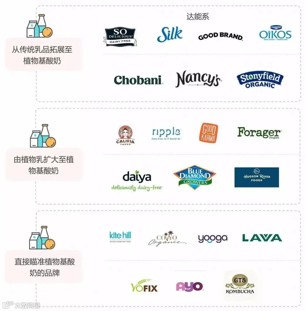 众多乳品品牌纷纷进入美国的植物酸奶市场。在传统乳制品领域中的so delicious、silk、chobani、stonyfield,从植物蛋白乳起家的califia、ripple、forager,与kite hill、coyo、yooga、lavva这些直接瞄准植物酸奶的新势力一起,共同描绘植物基酸奶的商业画卷。