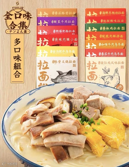 以一盒38元的招牌豚骨叉烧面为例,配料包中包含手工拉面、原为豚骨汤料、一大片叉烧肉篇、味付麻笋、木耳丝、寿司姜丝、芝麻包、葱花包、海苔片九小包,保留了原有的味道和大块完整的卖相,口感与新鲜食材的差异变得很小。