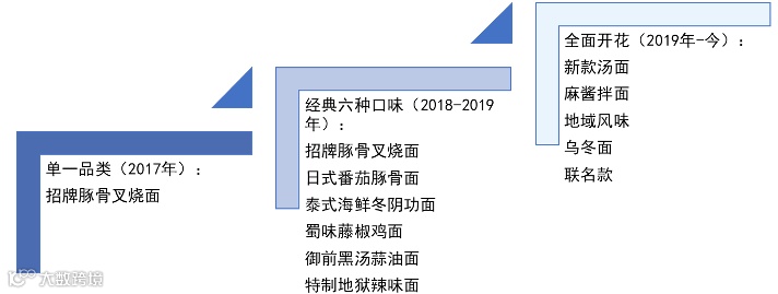 拉面说一直在持续延伸品牌线,从最初的单一口味,丰富到经典六款口味,现在已经作为一个平台不断增加新的菜品。