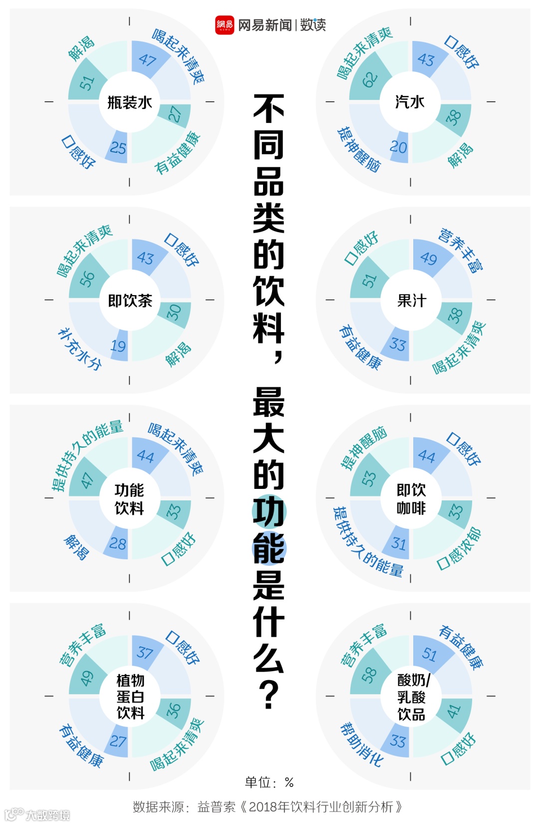 挑选咖啡饮品,能否提神醒脑被排在了首位。而在饮用植物蛋白饮料和酸奶饮品时,大部分人则冲着营养丰富。
