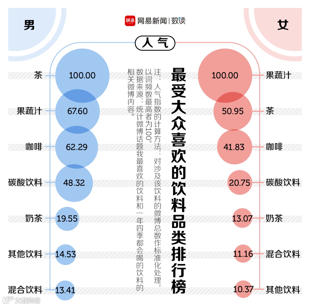 数读菌统计了微博“我最喜欢的饮料”等相关话题,发现整体上,茶饮、果蔬汁饮料和咖啡博取了最多消费者的欢心。