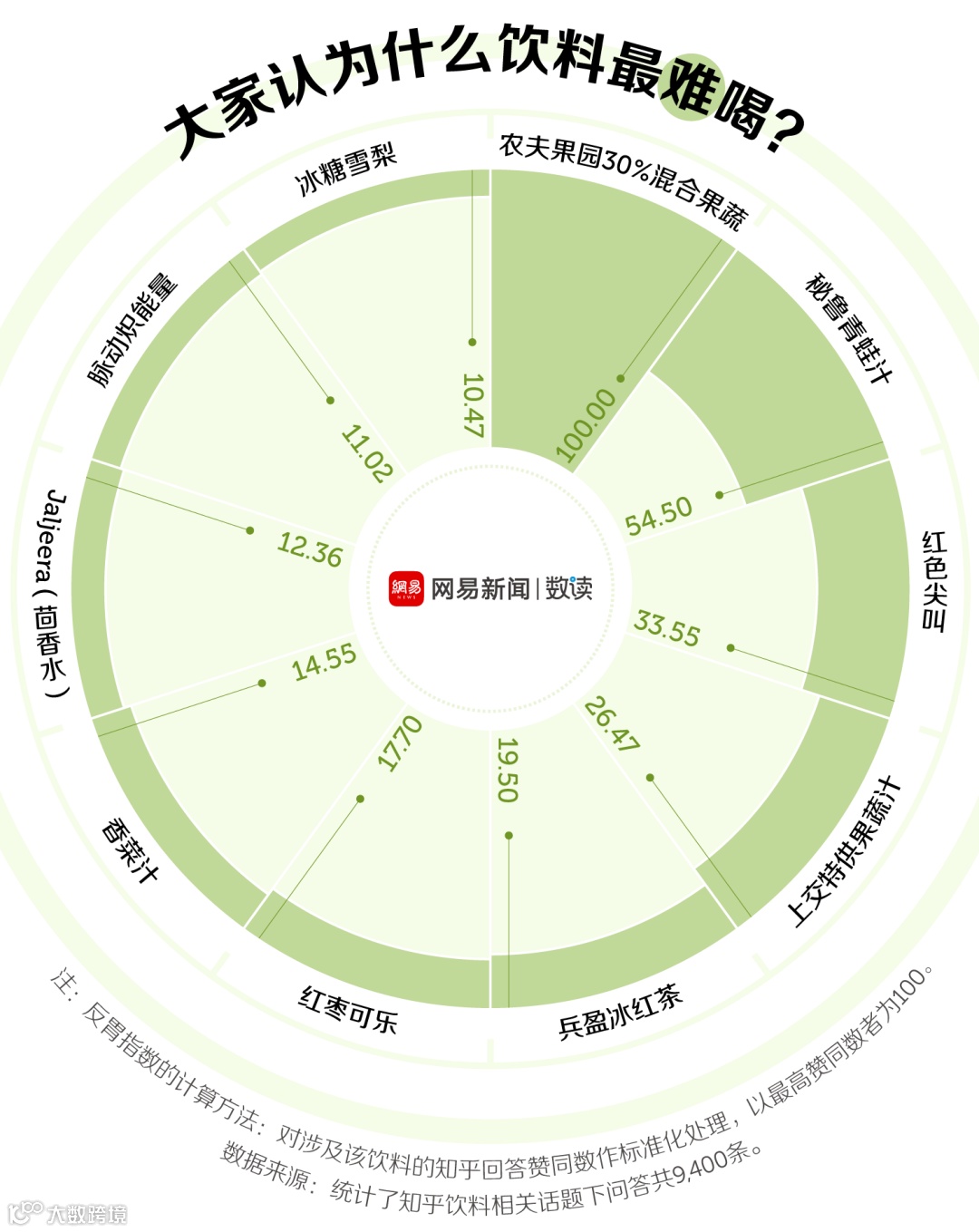 数读菌还统计了知乎网友最讨厌喝的饮料,发现了前十中有四种属于果蔬汁,例如排名第一的“农夫果园30%混合果蔬”,混合了多种不同的水果和蔬菜,但口味并不被一些消费者接受。