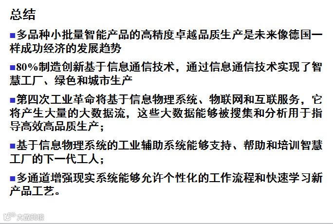 德国制造工业是世界上最具竞争力的制造工业之一,在全球制造装备领域拥有领头羊的地位。这在很大程度上源于德国专注于创新工业科技产品的科研和开发,以及对复杂工业过程的管理。德国拥有强大的设备和车间制造工业,在世界信息技术领域拥有很高的能力水平,在嵌入式系统和自动化工程方面也有很专业的技术,这些因素共同奠定了德国在制造工程工业上的领军地位。在挖掘新型工业化的潜能方面,德国将独一无二地开启一个新的工业时代:工业4.0。