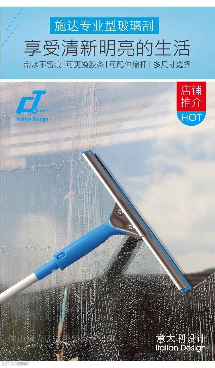 (7)玻璃刮:专门用于刮净玻璃水迹的工具。擦拭时用力均匀,效果较好。玻璃刮用铝合金杆和橡皮刮条制成, 是清洁玻璃及保养的主要工具。