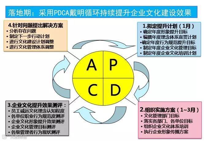 在企业文化管理中,导入PDCA循环工具的做法,获得了越来越广泛的企业认同,并取得了很好的实效,之所以将其称之为PDCA企业文化循环落地模型,是因为在P(计划)、D(执行)、C(检查)、A(改善)这四个阶段的企业文化管理与实践过程,确保了企业文化实践过程中的执行力和循环检视;而且,PDCA循环机制,并不是运行一次循环或周期就终止了,而是通过每一个PDCA周而复始地进行循环实践,通过企业文化管理使企业文化实践获得螺旋式的提升与发展。一个PDCA循环结束了,解决了一部分的问题,可能还有其它的问题尚未得到解决,或者循环过程中又出现了新的问题,再进行下一次循环继续改善。