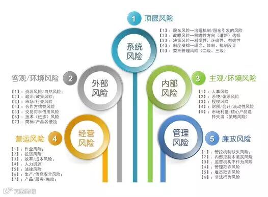 (1) 国有企业长期潜在着巨大的顶层风险。企业风险主要分布在“五个领域”:系统风险、外部风险、内部风险、经营风险、廉政风险(如下图所示)。为什么大多数国有企业普遍都潜在着系统性风险?