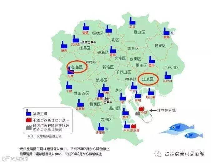 东京都 23 区最新的垃圾处理场分布图,可以看到杉并区和江东区的位置