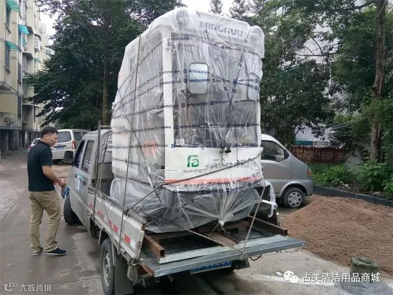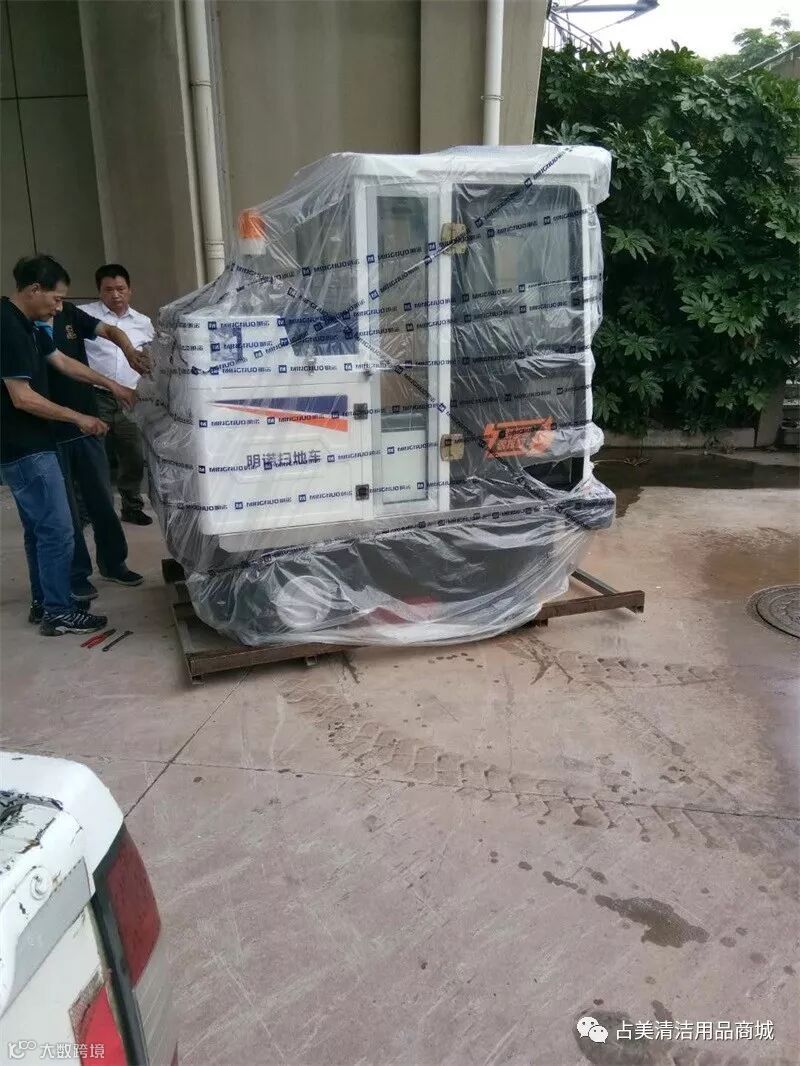 明诺MN-E800FB驾驶式扫地机顺利装上车,准备安全送往金华某学院。