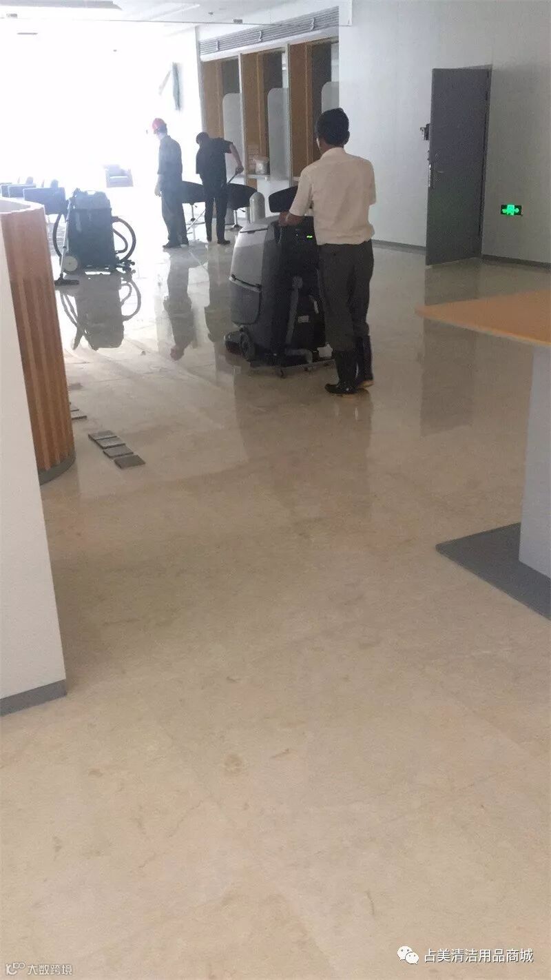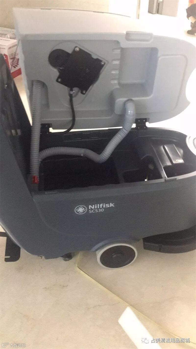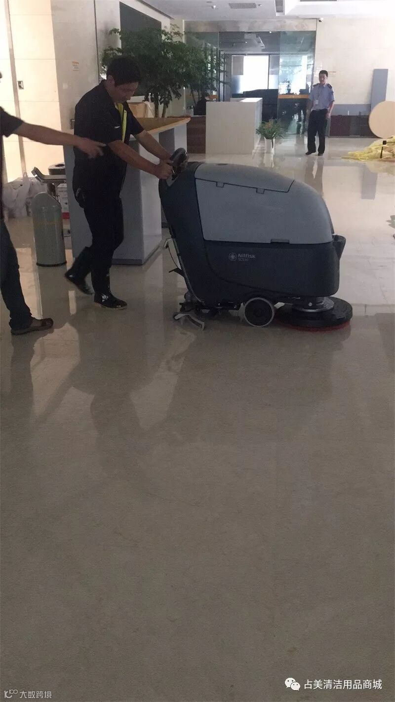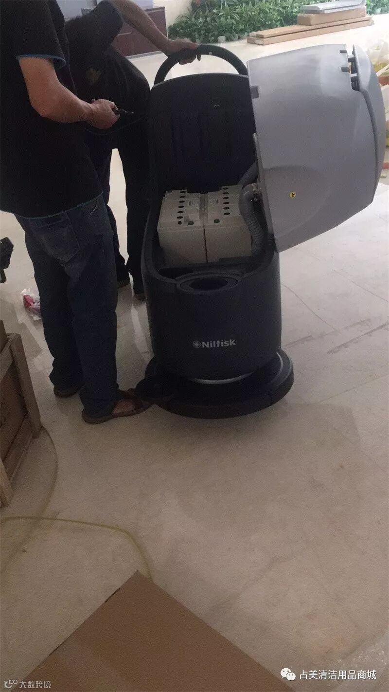 占美清洁用品商城售后部的维修师傅正在为客户调试洗地机,检查机器是否有故障。