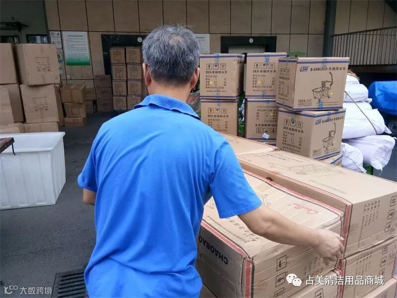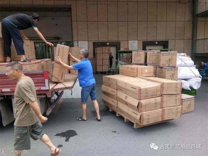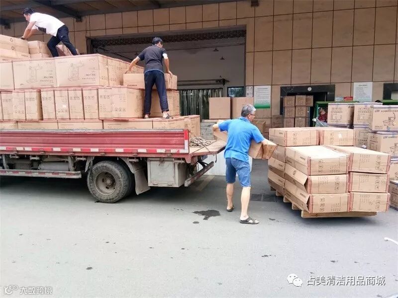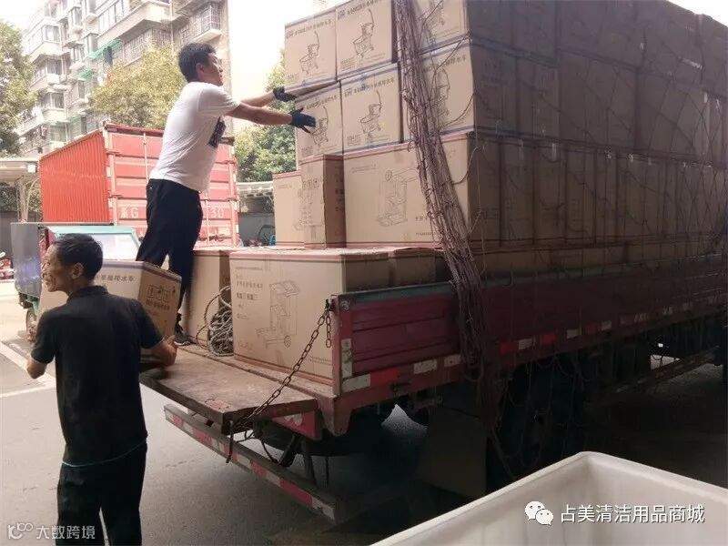 占美公司的同事们一起帮忙把多用途清洁服务手推车装上车