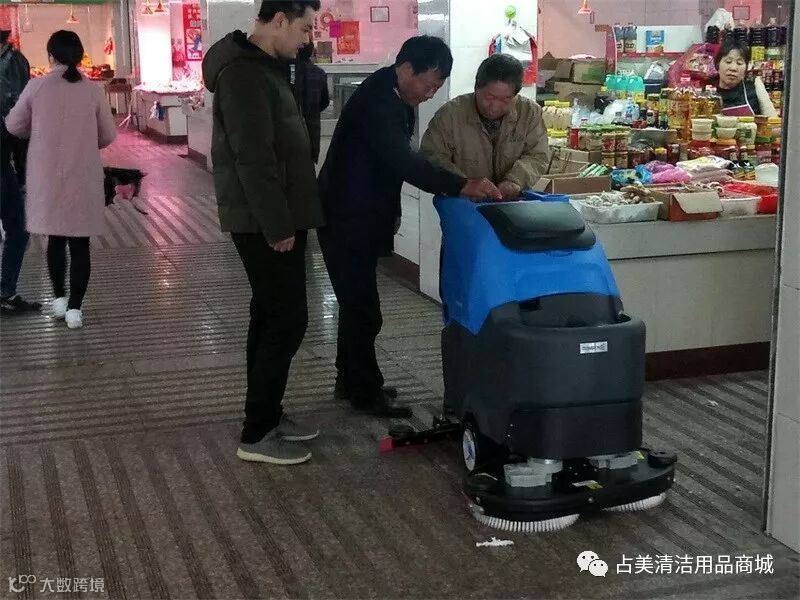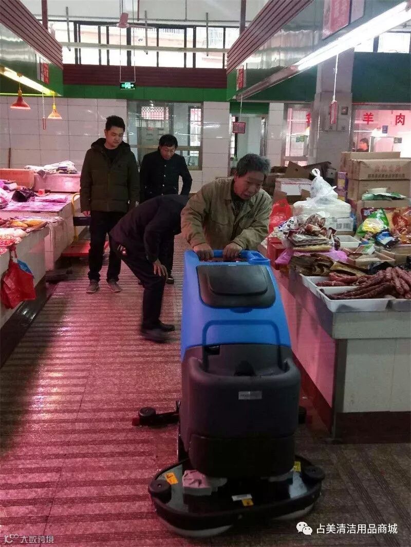 经过师傅一番耐心的指导后,市场的保洁员熟练的操作容恩R85BT全自动洗地机。