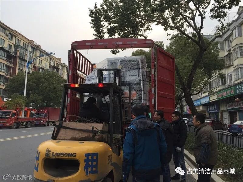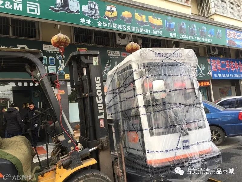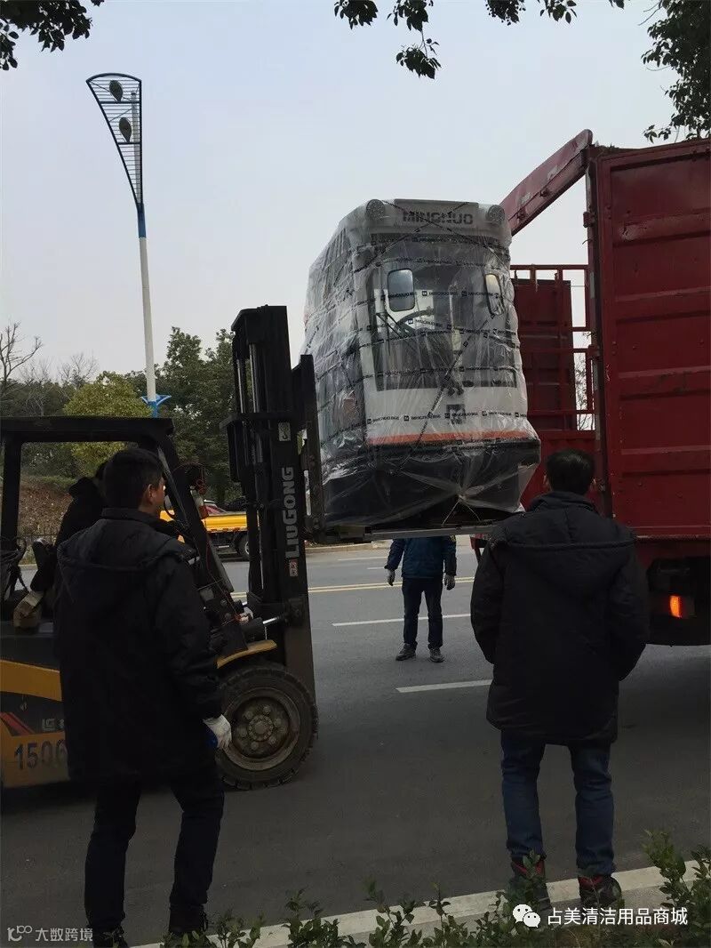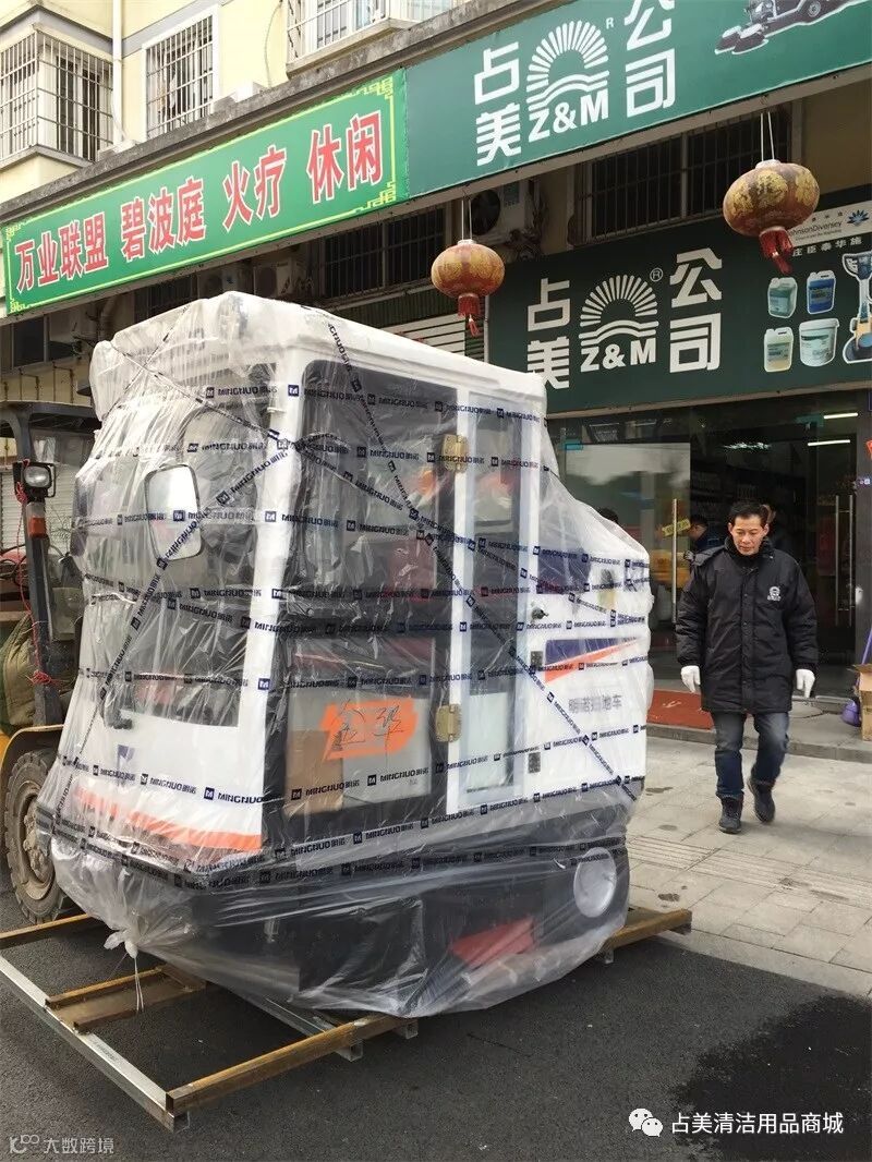 MN-E800FB驾驶式扫地车顺利卸下车,占美公司的同事们帮忙拆掉扫地机的原包装带,让它好好的感受一下占美公司大家庭独特的氛围。