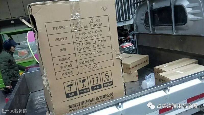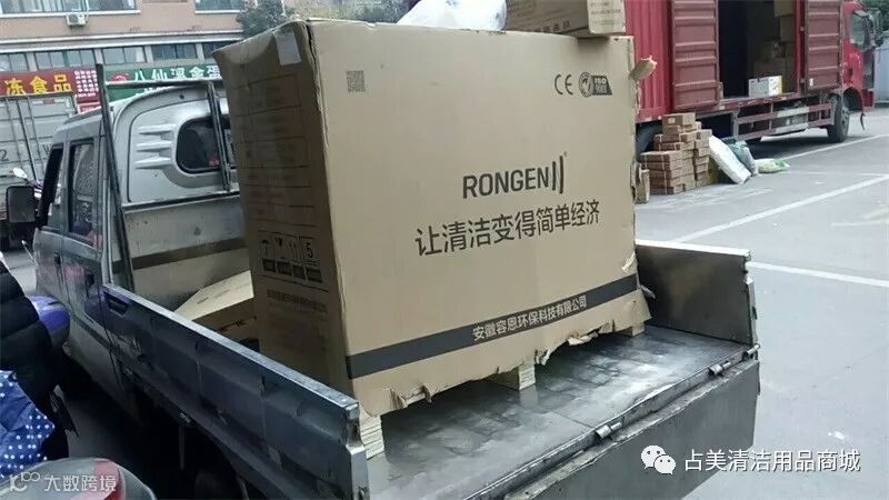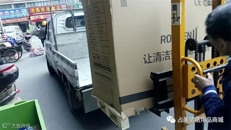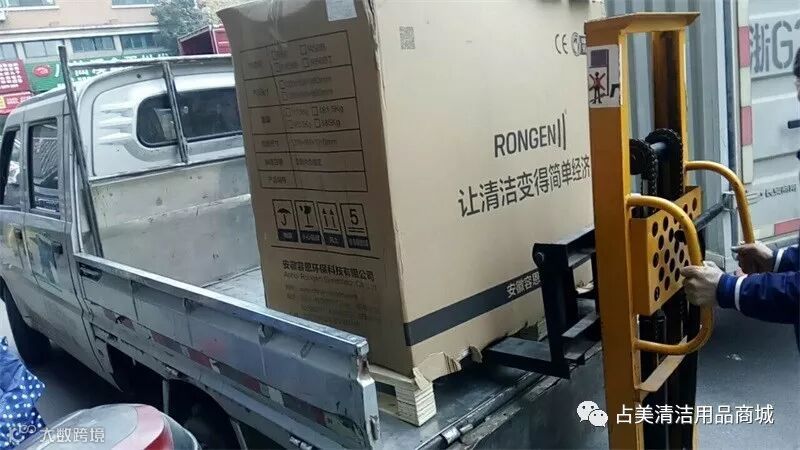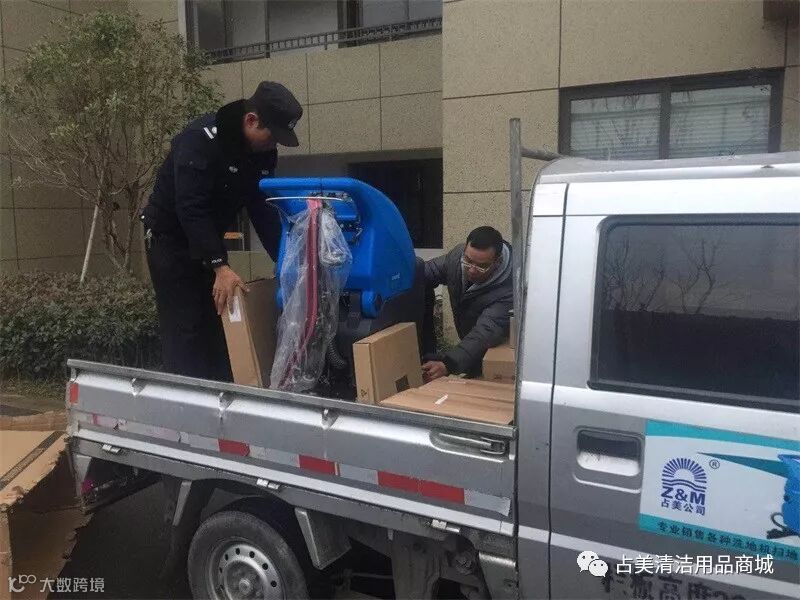 占美公司的同事把容恩R50B洗地机装上车。